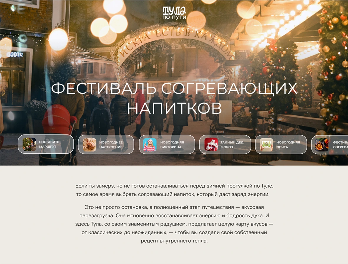 Нам удалось создать не набор разрозненных страниц, а целостный праздничный мир на портале «Тула по пути». Каждый элемент решает конкретную пользовательскую проблему — от планирования маршрута до поиска подарка и теплого места. Проект усиливает имидж Тулы как гостеприимного, современного и семейного зимнего направления, где технологии служат для создания живых, человеческих эмоций.
