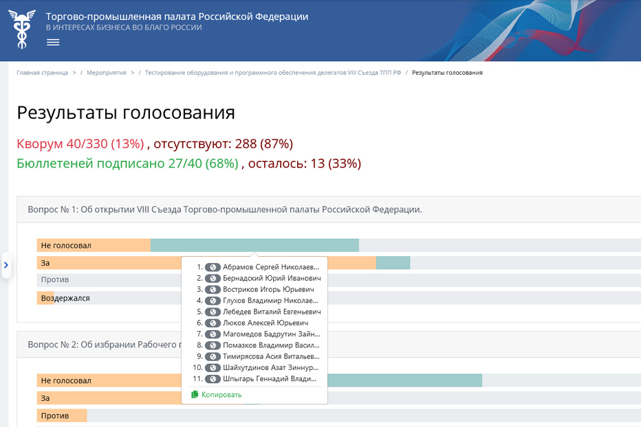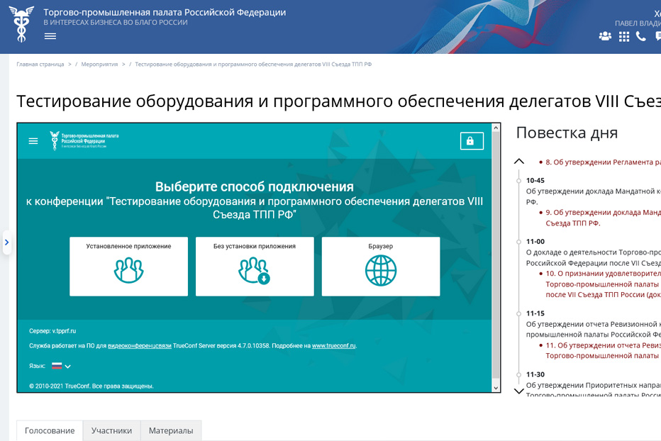 - Организовать техническое обеспечение съезда Торгово-промышленной палаты, проводящегося раз в 5 лет, с онлайн-голосованием и подписанием результатов голосования квалифицированными электронными подписями (КЭП) результатов каждым участником.