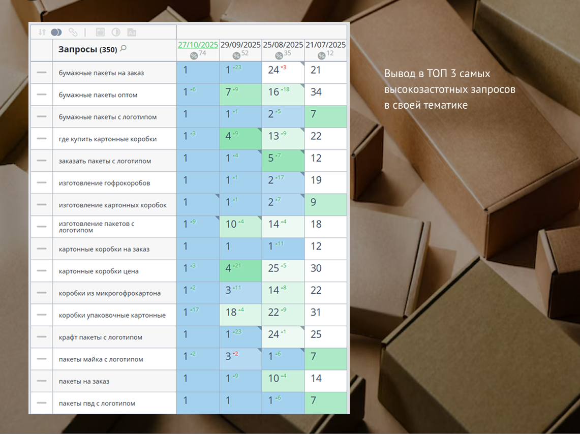 Вывести в ТОП-10 запросы по наиболее приоритетным направлениям к пику сезонности.