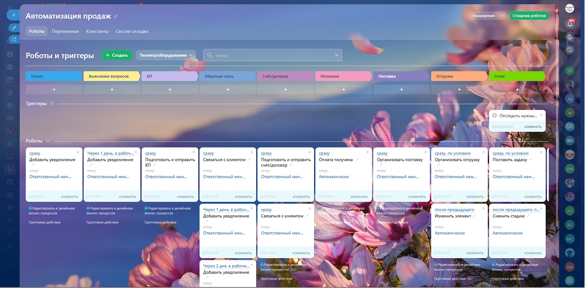После основных настроек портала, чтобы исключить человеческий фактор, мы настроили сценарии автоматизации. Теперь система сама уведомляет сотрудников о смене статуса сделки или событии.