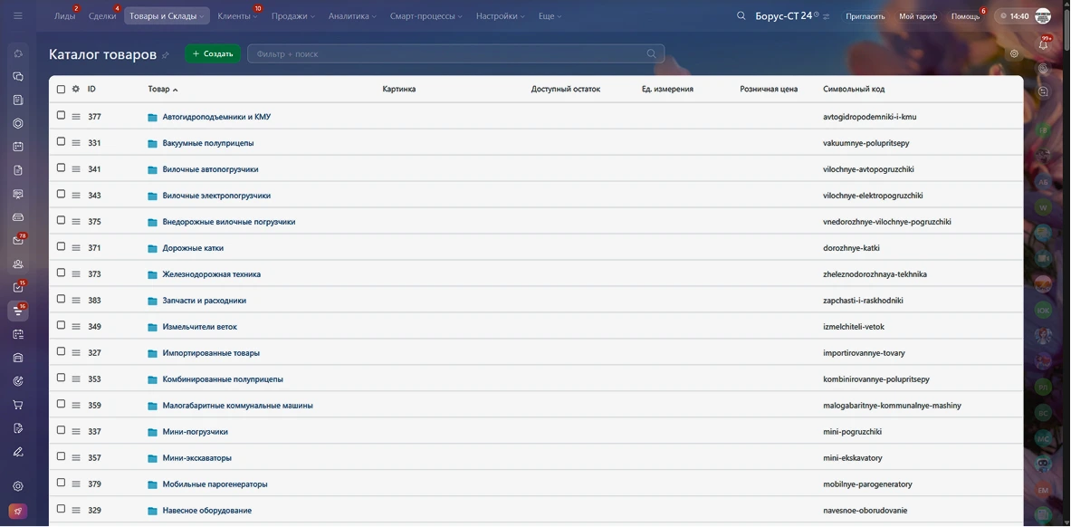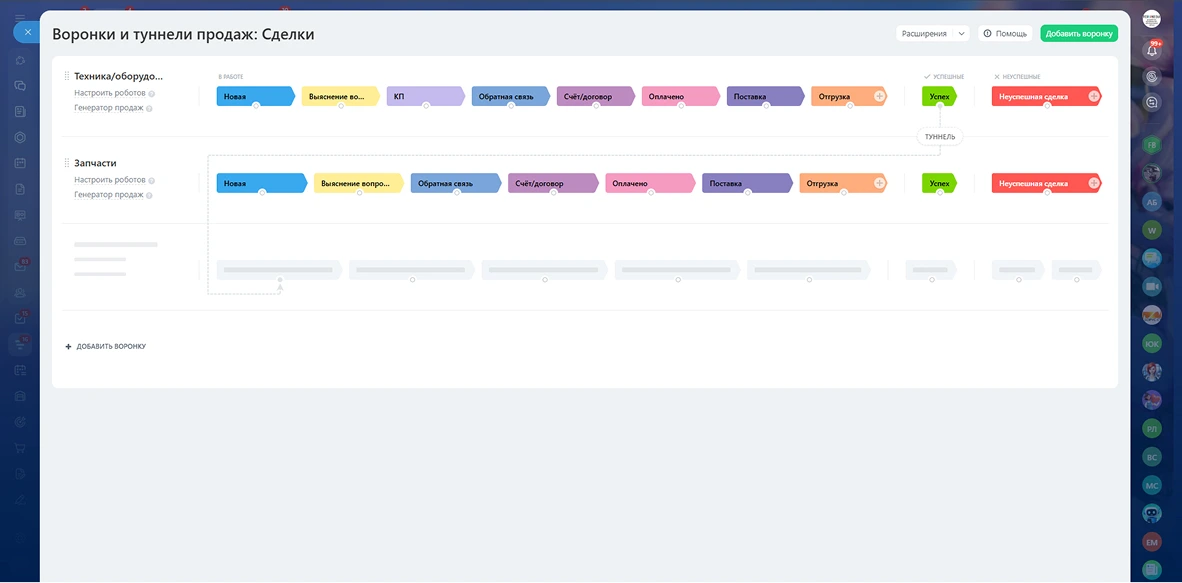 Мы выполнили базовые настройки портала и пригласили пользователей. Опираясь на реальные бизнес-процессы «БОРУС-СТ», мы детально настроили раздел системы управления: создали индивидуальные воронки продаж под разные направления (продажа техники/оборудования и продажа запчастей), кастомизировали поля для сделок, контактов и компаний, чтобы менеджеры видели только нужную для них информацию.