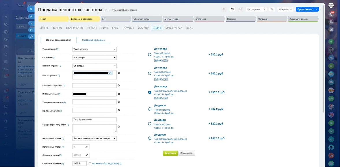 Самым востребованным для клиента этапом стала автоматизация доставки. Мы произвели интеграцию портала с сервисом СДЭК. Теперь менеджеры «БОРУС-СТ», не покидая интерфейса Битрикс24, могут прямо из сделки: