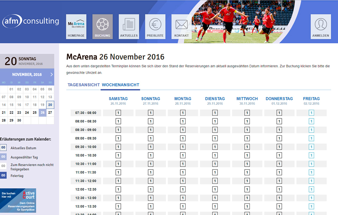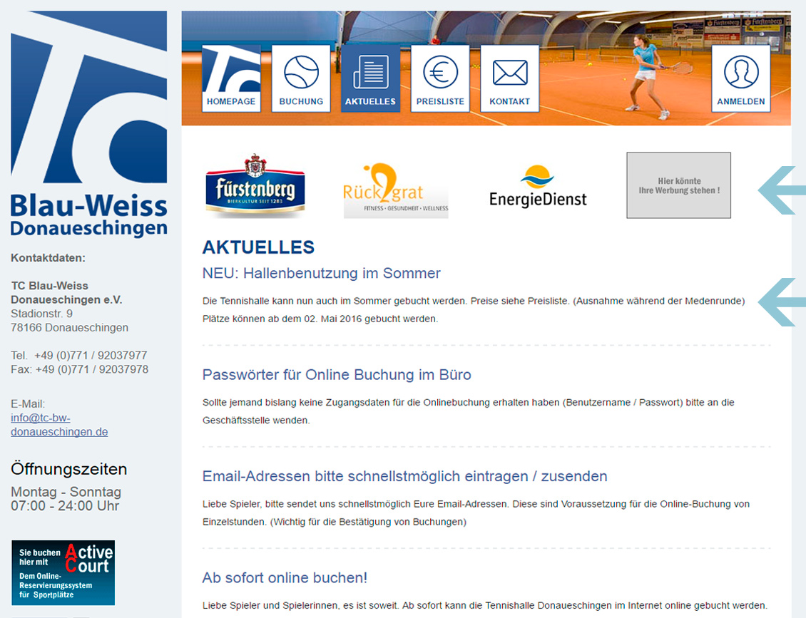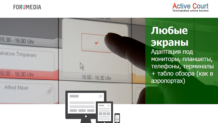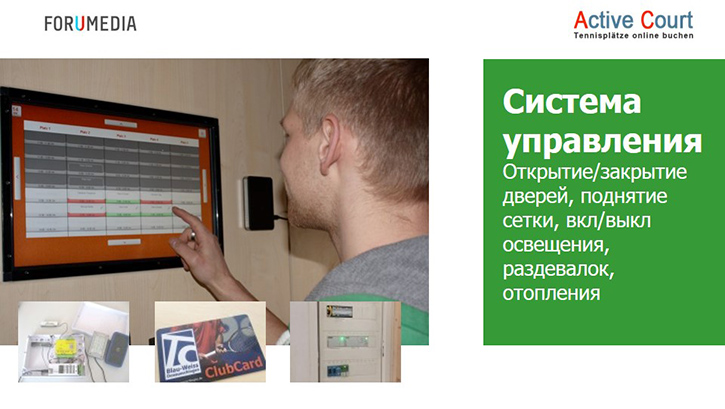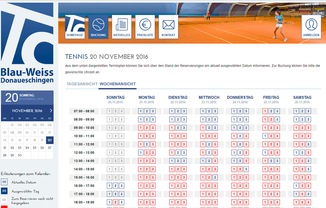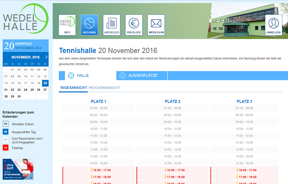 Нашу систему бронирования применяют многочисленные теннисные клубы и коммерческие крытые теннисные корты Германии. Но также она хорошо используется для футбольных залов, площадок для пляжного волейбола, бадминтона, стрельбы и даже для автобанов для записи фильмов и клипов.